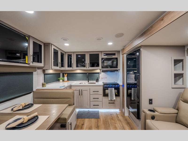 Sleeps 4 Slides 2 Length 33 ft 11 in Ext Height 11 ft 3 in Hitch Weight 802 lbs GVWR 9450 lbs Dry Weight 7486 lbs Fresh Water Capacity 45 gals Grey Water Capacity 90 gals Black Water Capacity 45 gals Available Beds Queen Refrigerator Type 12V Refrigerator Size 10 cu ft Cooktop Burners 3 Shower Size 30" x 36" Number of Awnings 2 TV Info LR 50" TV Awning Info 10' and 21' Axle Count 2 Shower Type Standard Electrical Service 50 amp Solar Wattage 400 watts Similar Floorplans