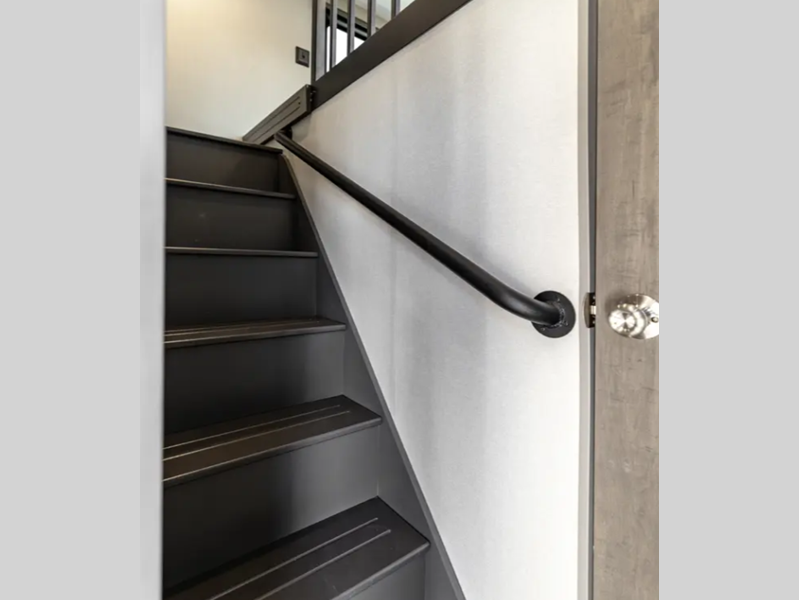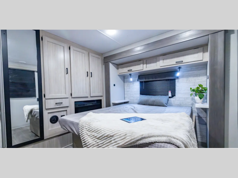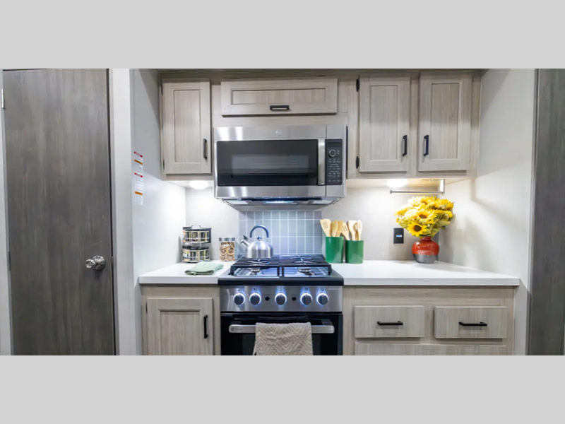 Each is built on a cambered structural steel l-beam frame so you can enjoy your RV for years to come, and EZ Lube axles with leaf spring suspension provide smooth towing. There are also premium JBL exterior speakers, a heavy duty tongue jack, universal solar prep, plus many more exterior conveniences. The interior will feel like a residential home with its GE appliances, seamless thermofoil countertops throughout, premium Serta mattress, and Congoleum woodplank linoleum flooring.